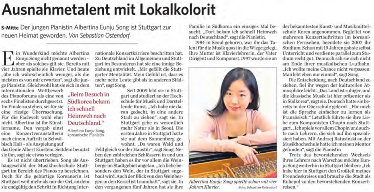 Die Pianistin Albertina Eunju Song konnte bereits mit zahlreichen internationalen Auftritten auf sich aufmerksam machen. Genannt seien z.B. solistische Auftritte mit den Solisten der Staatskapelle Dresden, dem Leipziger Streichquartett, in der Liederhalle Stuttgart, in der Alten Oper Frankfurt, im Bukarester Athaeneum in Rumänien, auf dem Piano Festival Rom, bei der Mozart Gesellschaft Stuttgart sowie Übertragungen im südkoreanischen Fernsehen „ARTE“. Sie wurde in Seoul, Südkorea, geboren und wuchs in einer Musikerfamilie auf. Ihre pianistische Ausbildung begann sie in Südkorea und setzte ihr Studium an der Staatlichen Hochschule für Musik und Darstellende Kunst Stuttgart fort. Hier schloss sie ihre Master und Konzertexamen Klavier mit Auszeichnung ab. Sie erhielt wichtige künstlerische Impulse bei Karl-Heinz Kämmerling, Bernd Götzke, Pavel Gililov, Andrzej Jasinski und Jura Margulis. Albertina Eunju Song ist erste Preisträgerin zahlreicher internationalen Wettbewerbe in Europa. 2011 gewann sie den 1. Preis beim Musikpreis des Lions Club Stuttgart-Schlossgarten und 2014 den Publikumspreis des internationalen Deutschen Pianistenpreises in Frankfurt. Im November 2019 führte Sie als Gewinnerin des Int. Klavierwettbewerbs „Humberto Quagliata“ Bachs Klavierkonzert in d-Moll mit dem Orchester di Arrezzo auf. Seit Mai 2019 übernimmt sie einen Lehrauftrag für Klavier an der SMTT.